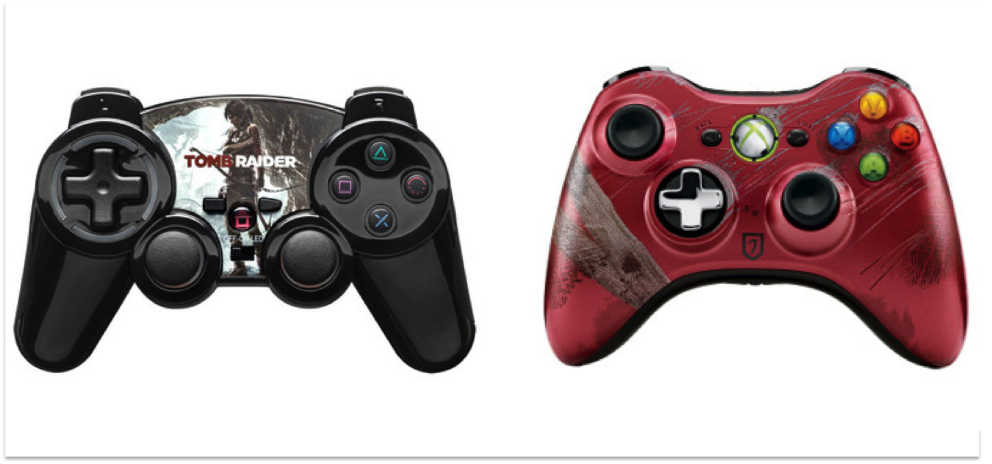 Une chose que j’admire sur ces manettes aussi, c’est les versions collectors. Et déjà avec la 360 je pleurais de voir combien Sony était en retard sur le sujet… À la sortie du dernier Tomb Raider, là où Microsoft nous offrait une manette du feu de dieu, détails et qualité de fou, Sony nous balançait une dualshock 3 qui ressemblait juste à un truc pas officiel avec un pauvre autocollant au milieu… *clap clap*.